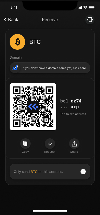 3. Once you've selected the asset, you'll be provided with your unique address. You can either scan the QR code or copy the address by tapping on the address field.