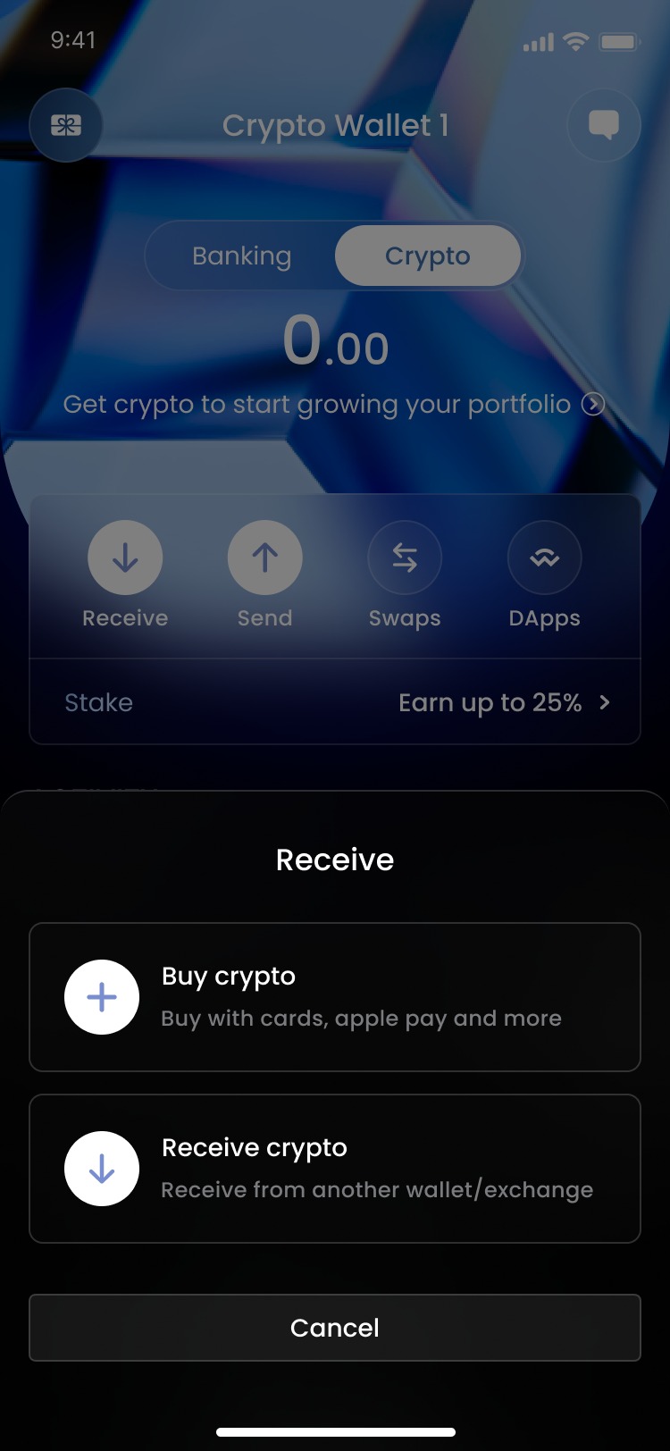 1. Navigate to the Crypto tab from the menu bar and click on "Receive".