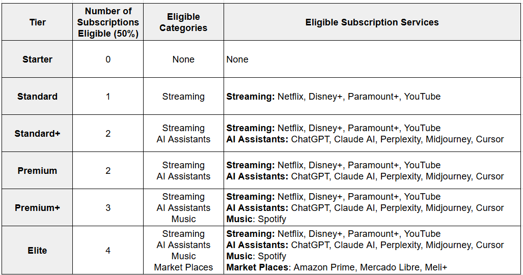 Example: You are on a tier that allows 50% subscription cashback for Streaming and AI Assistants (one subscription per category per month).