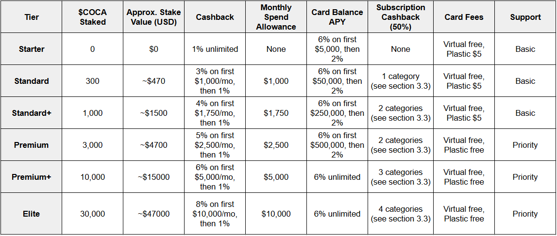 Eligible users (complete 1+ COCA Card transaction in August 2025) could access Premium or Elite tiers at a 50% staking discount if activated during September 2025.