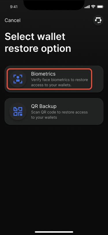 To recover your wallet using biometrics backup: