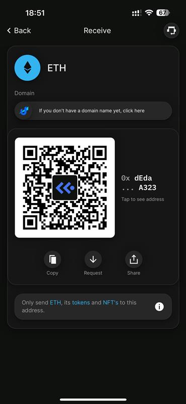 7. Once you've selected the asset, you'll be provided with your unique address. You can either scan the QR code or copy the address by tapping on the address field.