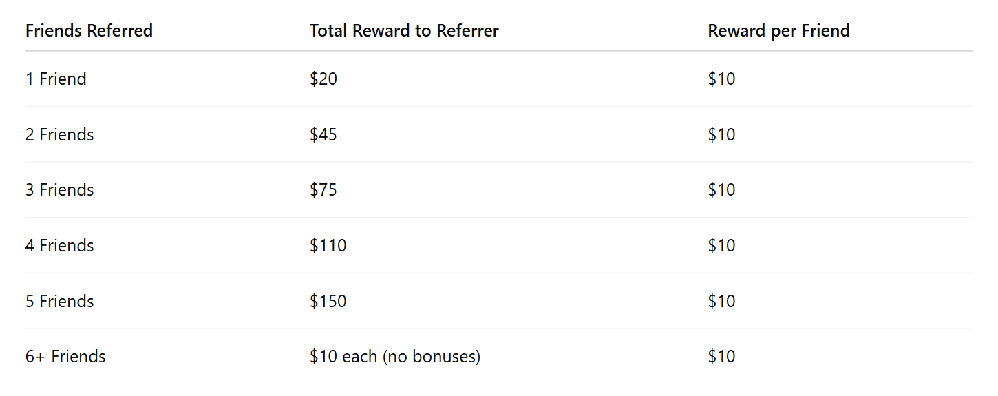 After your 5th friend, you’ll earn the standard $10 per referral, with no additional bonuses.