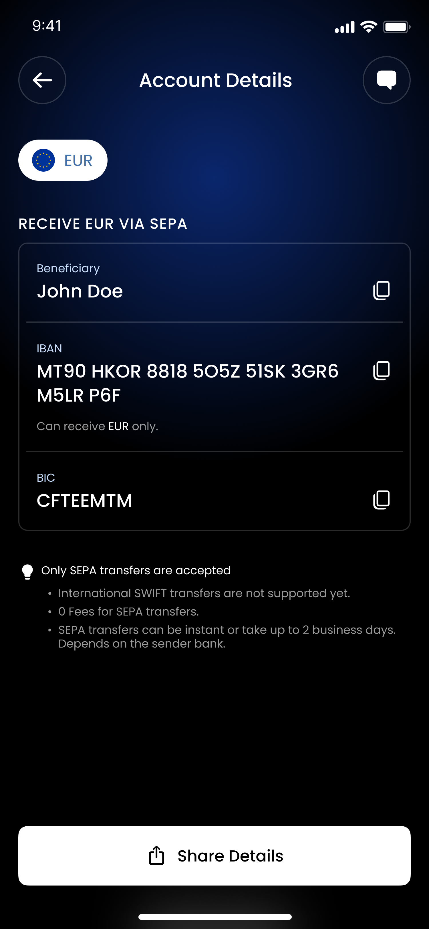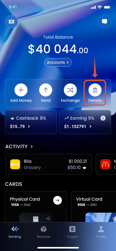 3. View your personal bank details (IBAN, account number, etc.).